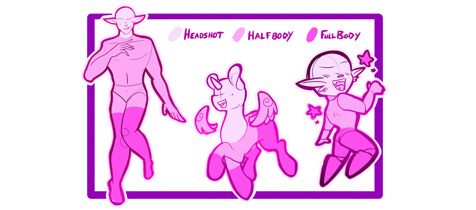 ♡ ⋆。˚ Size (headshot/half-body/full-body) and Color (Lineart/Scale Color/etc).